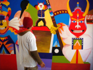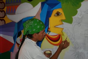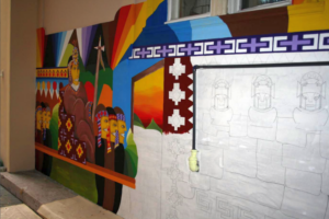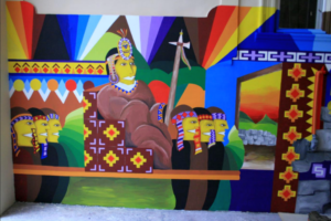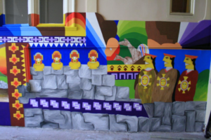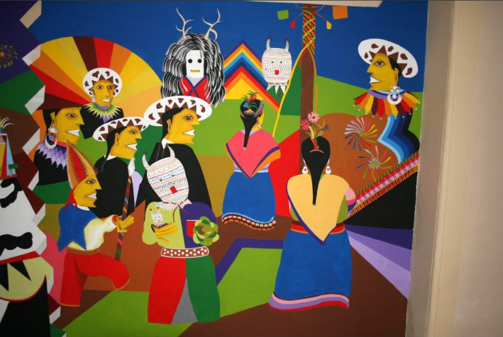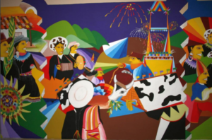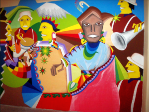«El mural que hoy apreciamos, representa la alegria de las fiestas andinas de tres paises: bolivia, ecuador y peru. La secuencia plasmada a lo largo de 24 metros, recoge el regocijo de personajes andinos y el colorido inspirado por la naturaleza propia de los parajes de la cordillera.»